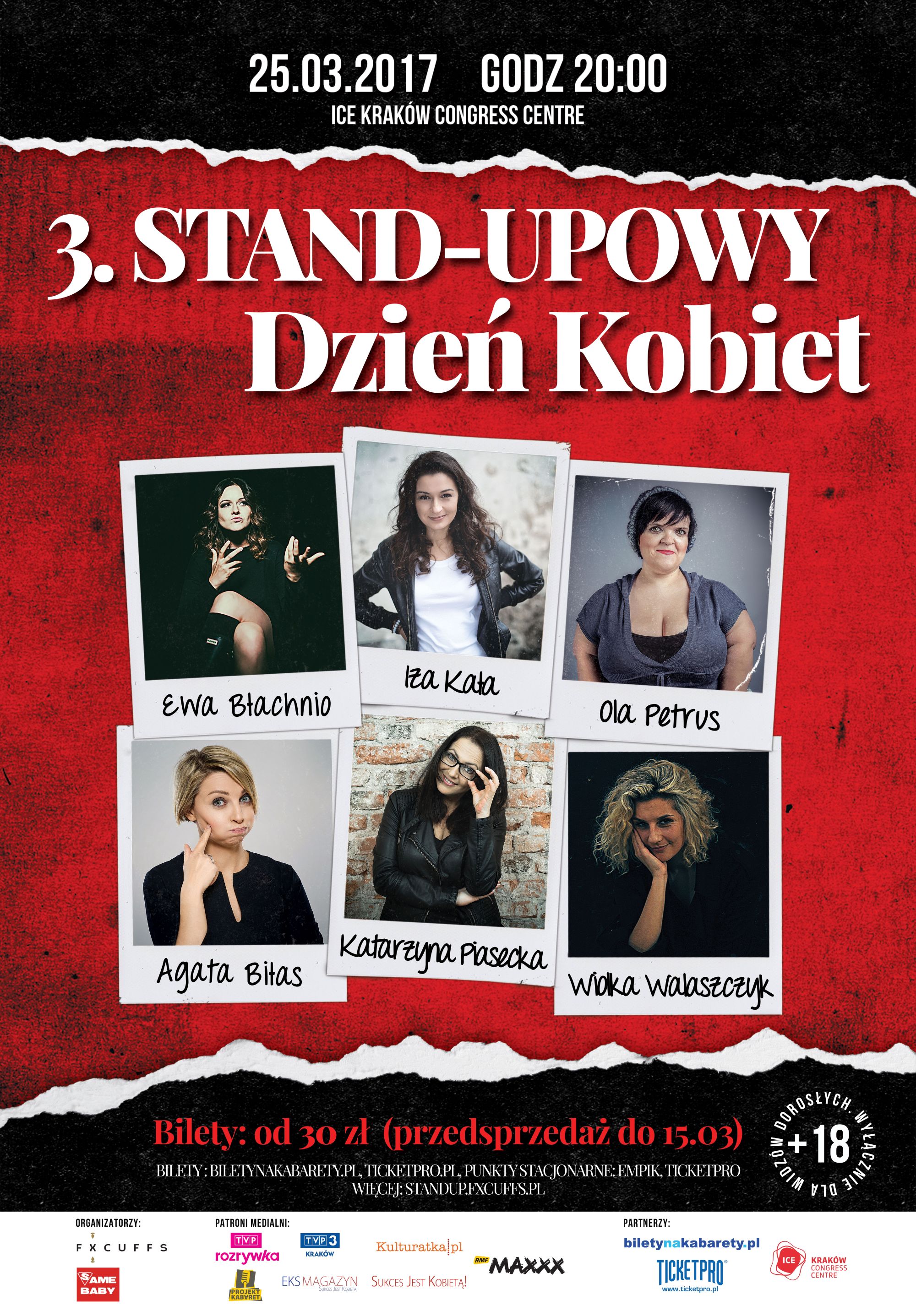 Już po raz trzeci w Krakowie odbędzie się sceniczne święto kobiet! Na 3. Stand-upowym Dniu Kobiet pojawią się najciekawsze i najzabawniejsze polskie artystki. Różnią się temperamentem, poglądami, długością włosów i wzrostem. Łączy je inteligentny humor, piękno i zawadiacka bezpośredniość. Na scenie wystąpią: Katarzyna Piasecka, Ewa Błachnio, Agata Biłas, Wiolka Walaszczyk i Ola Petrus. Całość poprowadzi Iza Kała. Zapraszamy na unikatowy wieczór, podczas którego zobaczycie wybuchową mieszankę silnych kobiecych osobowości. Program przeznaczony wyłącznie dla widzów pełnoletnich.