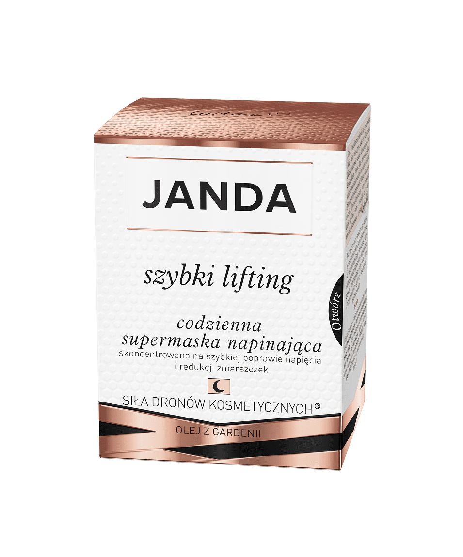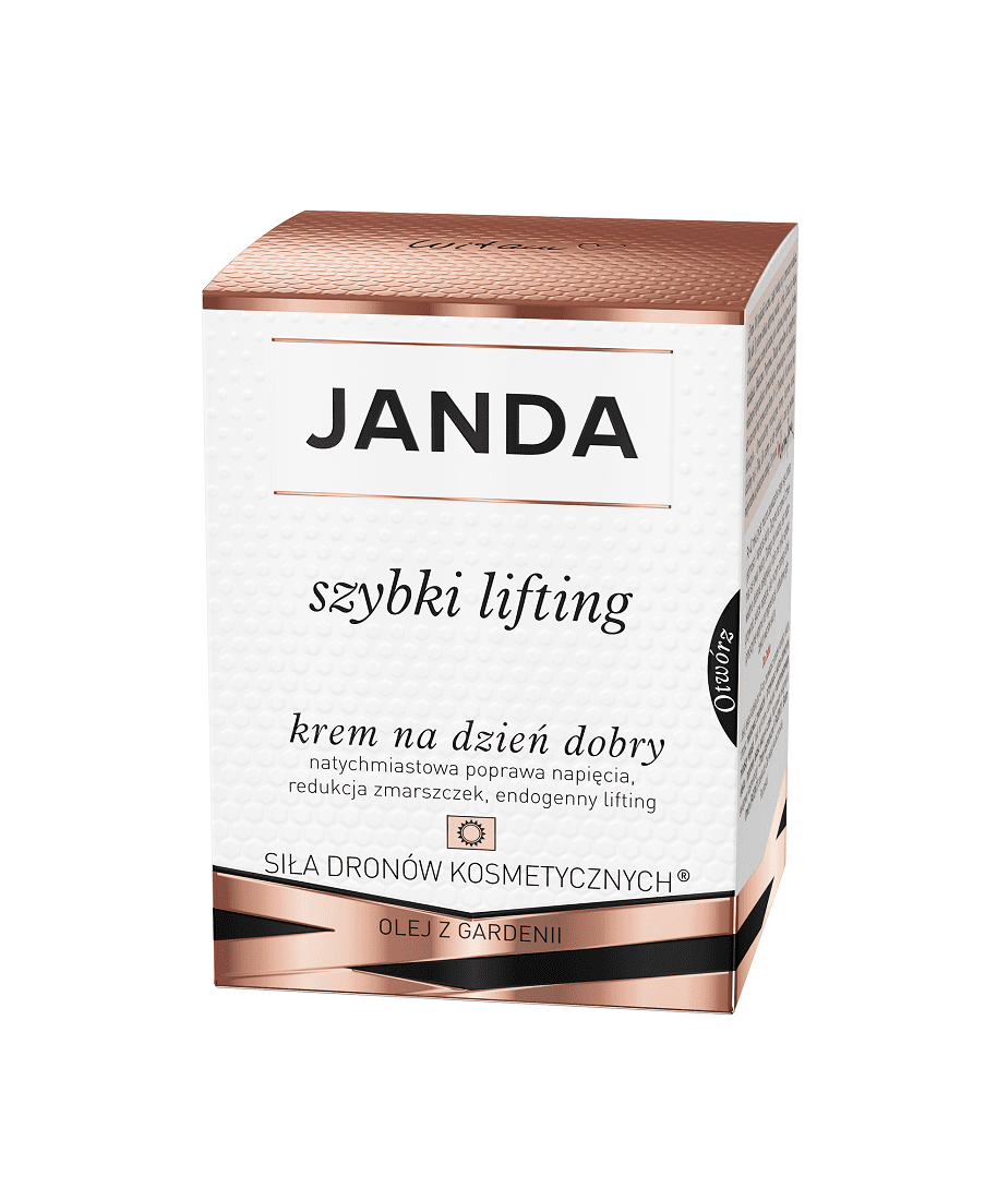 Odpowiada za elastyczność skóry, a jego brak jest boleśnie odczuwalny w postaci zmarszczek i utraty jędrności. Nasz organizm wytwarza go sam, ale po 25 roku życia stopniowo traci tę zdolność. Największe ubytki kolagenu mają kobiety w okresie menopauzy – wówczas jego produkcja spada o 30-35%. Sposób? Albo dostarczać kolagen do organizmu, albo… pobudzać jego wytwarzanie. JANDA przychodzi z kolejną, nową propozycją – linią SZYBKI LIFTING. W jej skład wchodzą kremy na dzień, na noc i pod oczy oraz codzienna supermaska napinająca. W produktach wykorzystano rewolucyjne drony kosmetyczne zawierające aktywny peptyd, który działa wyłącznie na skórę właściwą. Efekt? Znaczny wzrost ilości kolagenu i widoczna redukcja zmarszczek. To idealna propozycja dla Pań, które oczekują szybkich rezultatów.
