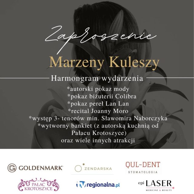 „Przed nam cudowne wydarzenie, które zbliża się dużymi krokami. Już 29 września 2023 r. w Pałacu w Krotoszycach (Dolny Śląsk) odbędzie się niezwykły pokaz mody, kreacji wieczorowych Marzeny Kuleszy. Ta autorska kolekcja, niesamowite tkaniny sprowadzane z całego świata i kunszt krawiecki wprowadzą Was w świat luksusu i bajkowych klimatów. W tym miejscu chcemy podkreślić, że to pierwszy pokaz projektantki, który od wielu lat żył w świecie marzeń a właśnie teraz wychodzi na świat i się realizuje. Tym bardziej nie może Was tam zabraknąć, bo to niesamowite przesłanie dla każdego z nas, że warto marzyć i w następstwie te marzenia realizować.”