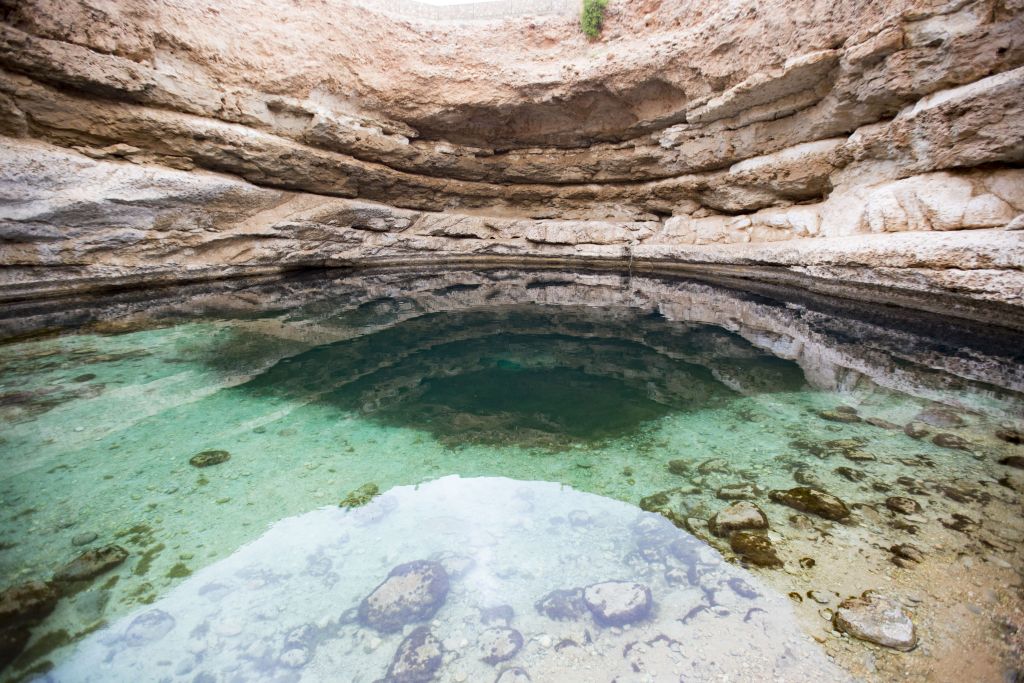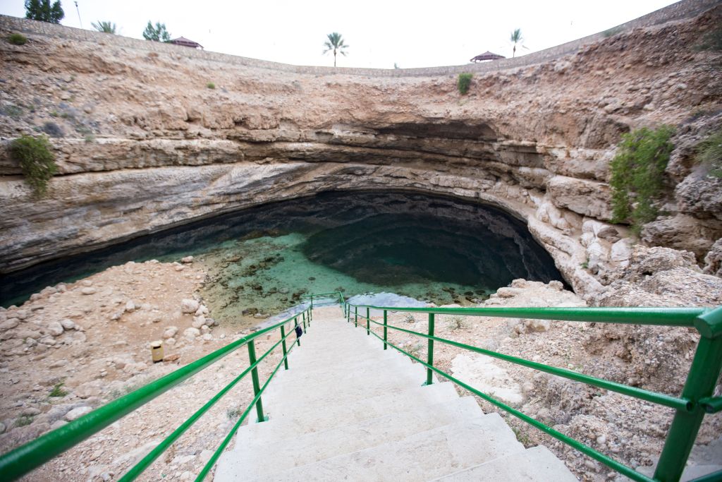 The main attraction of this wadi is submerged cave with waterfalls. Water proof bag to put your camera in and swimming towel are the most important items that you want to take along with you. It is best to combine your trip to Wadi Shab with visit to Bimmah Sinkhole. It is a huge…hole (!) where allegedly ground water meets sea water resulting in amazing color of which, that you won’t be able to take your eyes of. However once you do that, take a nice deep dive into water, which is allowed, and many tourists take opportunity to do that. This unique formation is a result of purely nature’s work and is located in Hawiyat Najm Park.