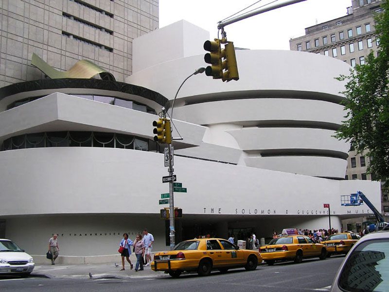 Muzeum zostało otwarte 21 października 1959, jako drugie muzeum utworzone przez Fundację Solomona R. Guggenheima. W pierwszym dziesięcioleciu XXI wieku budynek przeszedł szeroką, trwającą trzy lata renowację. Gmach, będący ostatnim wielkim dziełem Wrighta, podzielił krytyków. Od strony ulicy przypomina cylindrycznie zwiniętą, białą wstęgę, nieco szerszą na górze, niż na dole. Spirala zwieńczona jest szklaną kopułą. Wnętrze muzeum ma kształt wznoszącej się spirali. Obrazy wystawiane są na ścianach spirali, a także na dodatkowych poziomach. W 1992 do budynku dobudowano wieżę, wyższą od zaprojektowanej przez Wrighta spirali, autorstwa Gwathmey Siegel & Associates Architects. Do tego czasu gmach muzeum zyskał status ikony, a więc zmiana oryginalnego projektu Wrighta stała się powodem wielu kontrowersji. Jedynym polskim artystą, który miał wystawę w Muzeum Guggenheima, był Wojciech Fangor.