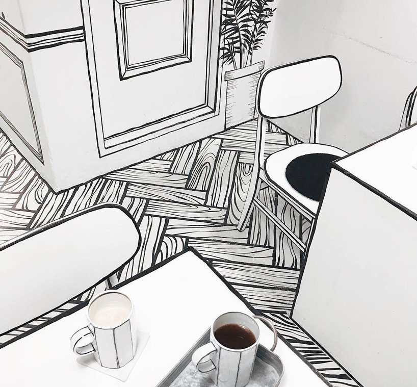Właśnie taki, dwuwymiarowy świat, powstał w tej wyjątkowej kawiarni. Od podłóg i ścian, przez meble, po naczynia – prawie wszystko daje iluzję płaskości, którą wspiera dobrze skomponowane oświetlenie ograniczające rzucany cień.